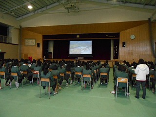 最初に顧問の長谷川先生から、京都橘高校と太鼓部について、スライドを使って説明をしていただいた後、太鼓部約40名の迫力のある演奏に移りました。一人一人の技術の高さや真剣さ、そして全体の迫力と調和のある動きに圧倒されました。