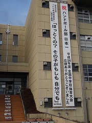 ハンド部の全国大会優勝を記念して、校舎に垂れ幕と巻き上げ機を京田辺市に設置していただきました。2枚の垂れ幕がおろせるので、先日取り組んだいじめ追放宣言にちなんだ、いじめを防止する標語についても掲示しました。旧国道からも正門からも見える立派なもので、培良中生の励みになるものです。京田辺市長様はじめ市の皆様、本当にありがとうございました。