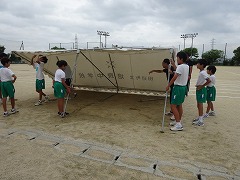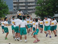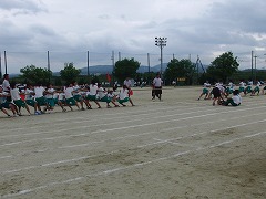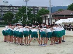 2年レスキュー綱引き 3年木津川下り 競技前、みんなで気合を入れる