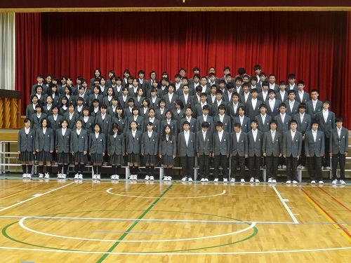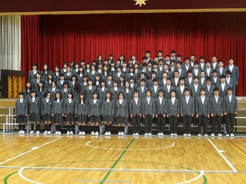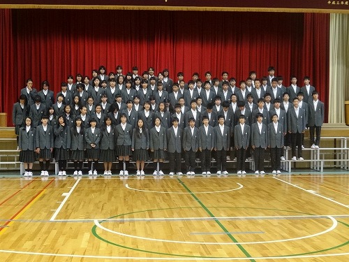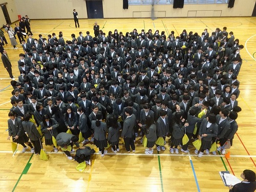 本日6校時後、体育館で、市制20周年の全校および学年の写真を撮りました。計画していた並び方とは違ったので少し混乱しましたが、みんなが協力してくれたので、何とかスムーズに撮り終えました。全校生徒があんなにコンパクトになるなんて、上から見ているとちょっと不思議な気分になりました。本物の写真は、プロの写真屋さんにとっていただきましたので、出来栄えが楽しみです。