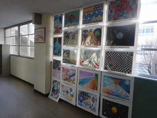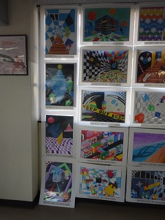 小学校で開催された作品展に、中3の作品「立体感のある平面構成」を数点出品し、小学生や小学生の保護者の方にも見ていただきました。絵のレベルの高さ、特に緻密さに驚きの声が上がっていたそうです。