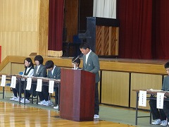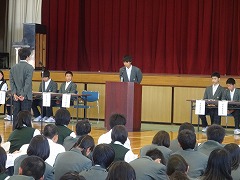 本日6校時、体育館で生徒会総会が開催されました。生徒会本部と各委員会の委員長が、昨年度と今年度の活動の方針等を説明し、質問に答弁しました。後半は、各学級の代表が前に並び、学級目標を提示して、学級の様子や目標に込めた思いを話してくれました。また、総会の冒頭では、一昨年度制定した「培良中学校いじめ追放宣言」の制定の経過説明の後、生徒全員で宣言を読み上げました。いじめを許さない、温かな人間関係の学校であり続けたいと、改めてみんなで決意しました。