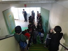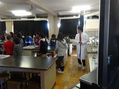 校舎内を並んで参観に回りました。 理科 水素燃焼実験 柔道場で説明を聞く