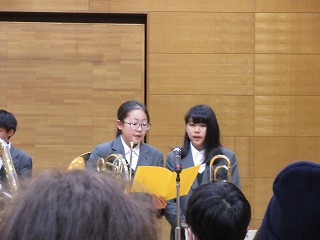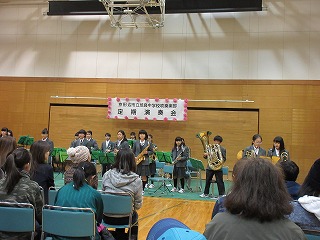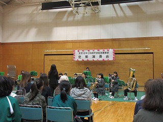 本日、京田辺市中部住民センターせせらぎで、吹奏楽部の定期演奏会が開かれました。多くの地域の方々や保護者の皆さんに来ていただきました。秋に3年生が引退し、人数も少なくなりましたが、1・2年生だけでも、しっかりと演奏ができていて、安心して聞けました。