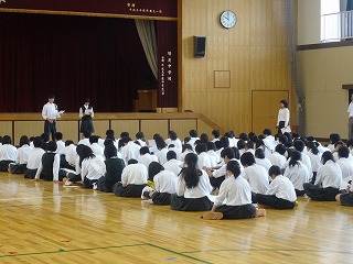 1年生は、挨拶の声や発言などとても元気なのが特徴です。また、男女を含め学年が大変仲が良いのも特徴です。その素直さとパワーを今後、日々の学習や合唱コンクールでしっかりと発揮して、前進を続けることを目標にしています。