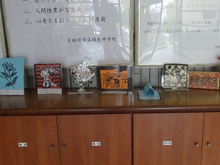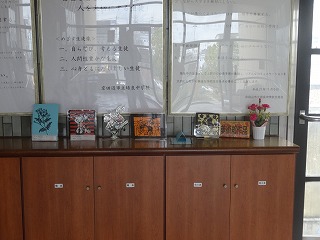 美術部による職員玄関の展示、模様替えをしました。学校にお越しの折にはぜひご覧ください。