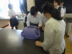 聖カタリナ高校からは、看護の講座でした。医療従事者の一番の基本、手の洗い方について、徹底して教えていただきました。きれいに洗ったつもりでも、手に特殊なクリームをつけ機械で見てみると、爪付近に細菌が残っていることが分かりました。