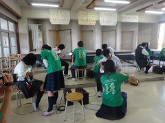 京都翔英高校からは、先生だけでなく、たくさんの生徒の皆さんも来ていただき、軽音楽の演奏と、楽器の体験、簡単な指導をしてもらいました。高校生の活き活きとした姿に、感銘を受けるとともに、楽器に触れ、一人一人教えてもらって楽しい時間を過ごしました。
