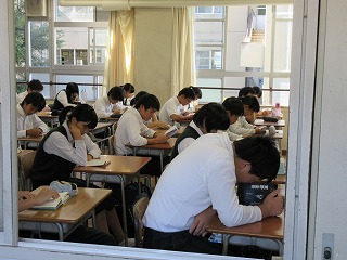 昼休み、校長室前の廊下で何やら英語のしゃべり声がします。ALTと誰かがしゃべっているようです。覗いてみると3年生の生徒でした。10分近く、英語で会話をしていました。内容は聞いていませんが、英語だけで10分近く話ができることに驚きました。改めて英語は教科の勉強としてとらえるだけでなく、言葉として使ってみることが大切で、上達の早道だと思いました。