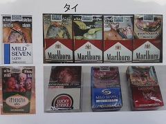 話を聴く タバコの肺への害を示す模型 海外のタバコ 箱に黒くなった肺が印刷されている。