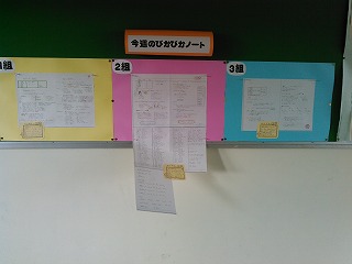 本校は、今年度特に家庭学習の充実に力を入れていますが、1年生は、2学期まで毎日、1枚プリントに自分で課題を選んで勉強してくる家庭学習を行ってきましたが、3学期からは、各自1冊ノートを用意して、家庭学習に取り組んでいます。各学級の優秀なノートが学年掲示板に掲示されました。