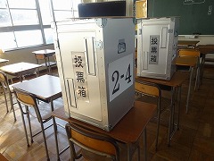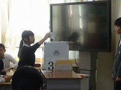 立会演説後、教室で投票しました。投票箱は、市の選挙管理員会から借りてきた、実際の選挙で使われている投票箱です。京田辺市選挙管理委員会の皆様、ありがとうございました。どの役職も信任投票です。結果は明日の朝発表です。