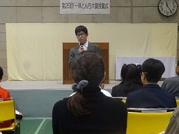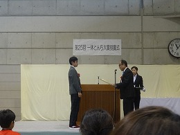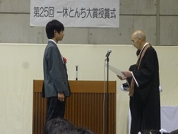11月20日(日)、京田辺市中央体育館で、一休とんち大賞の授賞式が行われました。培良中学校は、中学生川柳の部で2人の入賞者が出ました。一休とんち大賞(京都府知事賞)に3年生立嶋君、佳作(京田辺市観光協会理事長賞)に2年生林君です。