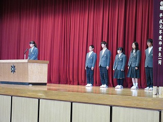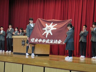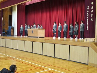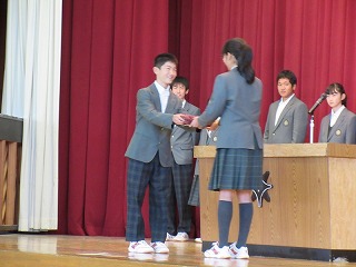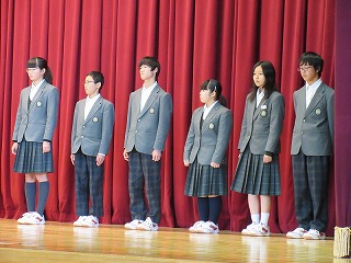 終礼後、新旧の生徒会の引き継ぎ式が行われました。すでに、小6体験入学のときから動いてくれていますが、これからは、いよいよ新生徒会役員が学校を引っ張っていきます。旧本部役員の皆さん。本当にご苦労様でした。様々な活躍が思い出されますが、特に、昨年2月の気仙中学校とのやり取りを通じて行った震災学習や、工夫を凝らして大成功した全校合唱練習など、数々の業績をあげてくれました。新生徒会役員もきっと頑張ってくれると思いますが、信任した全校生徒も、しっかりと本部役員を支えてほしいと思います。