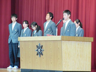 校歌斉唱後、私からは12月4日から始まる人権週間に向けて、この機会に、人権について今まで以上にしっかりと考え、行動するようにと話をしました。特に、本校の特色である、「いじめ追放宣言」をもう一度しっかりと読んで、内容を確かめてみるように話をしました。