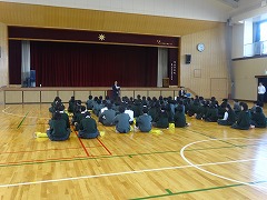 本日2年生は、6校時、体育館で福祉学習に取り組みました。目の不自由な方を講師に迎え、目の不自由な人が生活の中で、どのようなことで困っているのか、また、どのような助けを必要としているのかお話を聞きました。