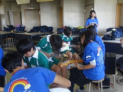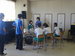京都翔英高校 数十名の高校の生徒さんに来ていただき、軽音楽の楽器の基礎を丁寧に教えていただきました。ドラム、ギター、ベース、キーボードで最後は演奏にも挑戦しました。