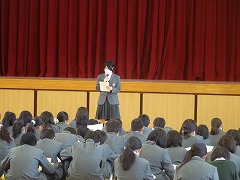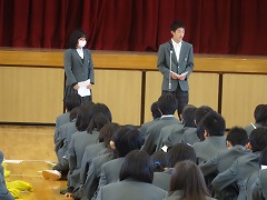 2年生は、評議員会による、学年や学級のまとめを発表してくれました。修学旅行や3年を送る会の取組を通じ、学年・学級の団結やまとまりが強くなったこと、発表など、授業に積極的に参加する人が増えたこと、家庭学習をがんばる人が増えたことなどが良かった点として挙げられていました。しかし、一部に授業中の私語、掃除をいい加減にする人がいるなど課題も出されました。そして、来年度、最上級生になるにあたって、卒業した3年生以上に良い学年になって学校を引っ張っていきたいということや、進路実現を目指して頑張ることなど、とても頼もしい宣言で締めくくっていました。