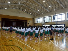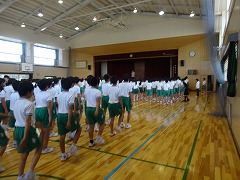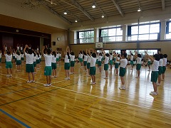 体育大会まで1週間を切り、本格的に練習するこの時期になって、雨に悩まされています。昨日は、6校時全校体育で、行進とラジオ体操、各競技の練習を予定していましたが、午前中の雨と午後からの強風で、体育館に場所を変えて練習しました。
