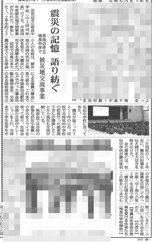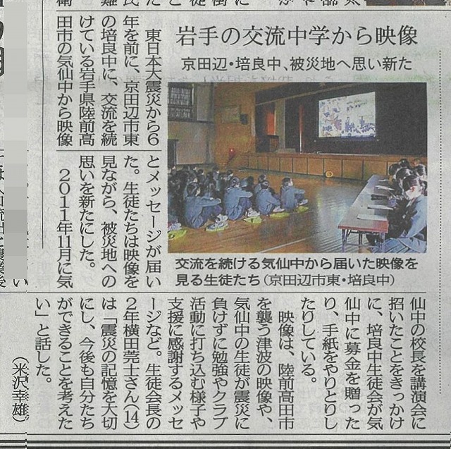 3月7日に行った被災地交流の記事が新聞に掲載されました。紹介します。取材いただいた京都新聞社様、洛南タイムス社様、ありがとうございました。