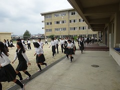 京都府南部に緊急地震速報が流れ、その後大地震、地震による出火、グランドへ避難という手順で行いました。避難の指示が出てから、グランドでの全員点呼まで3分12秒。これは、昨年度6月に出した3分50秒を大幅に短縮し、今までで一番速く避難できました。新記録です。特にグランドに出てから、列を崩さずに素早く駆け足で集合できたのと、点呼が手際が良かったことが、タイム短縮につながったと思います。