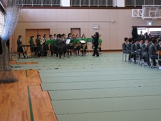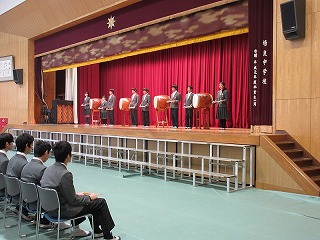 本日3・4校時、全校で3年生を送る会を行いました。吹奏楽の演奏で、3年生が入場し、生徒会の培良太鼓、1年生の発表(寸劇と呼びかけ、合唱)、2年生の発表(呼びかけと合唱)、3年間の思い出を振り返る写真スライド、3年生の発表(呼びかけと合唱)という内容でした。