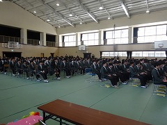 今日、3・4校時を使って体育館において、3年生を送る会が開かれました。吹奏楽の演奏にのって、3年生が入場し、生徒会本部による培良太鼓、1年生、2年生の発表と続きました。1・2年生の発表は、いずれも歌と呼びかけでしたが、3年生の頑張ってきたことへの賞賛、3年生への感謝、今後培良中をしょって立つ決意に満ちていました。特に2年生の部活の先輩への感謝の言葉はジーンとくるものがありました。長い時間、同じ目的に向かって甘苦を共にしたからこその言葉だと思いました。