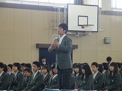 今日は、東日本大震災が起こって丸4年です。朝、震災について話をしました。また、開会あいさつでも、本校が募金を続けている岩手県の気仙中学校の現在の様子についても触れました。