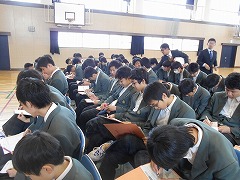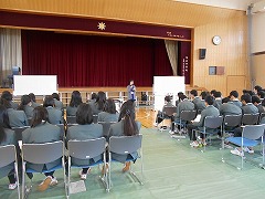 3月8日3校時、3年生は体育館で一斉に認知症サポーター講座を受けました。高齢化社会を迎え、近い将来、700万人にも及ぶ認知症患者が出現するともいわれています。家族や親せき、近所で認知症の方と接する機会が今後随分と増えてきます。