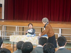 そのような状況の中、福祉学習の一環として、認知症について正しく学び、どのように接すればいいのかを会得し、地域の一員として何ができるかを考える機会としてこの講座を設定しました。 講師は社会福祉協議会の認知症サポーターの方々です。話だけでなく、寸劇を使って認知症対応の失敗例や正しい対応の仕方などを考えました。みんな集中して話を聞き、しっかりと反応して、認知症について多くを学びました。