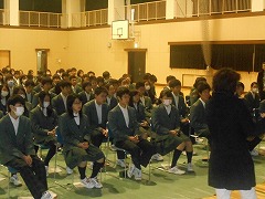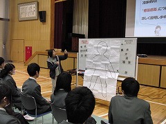 3月9日3校時、3年生は体育館で性に関する学習を行いました。講師は、山城北保健所から来ていただいた3人の保健師の皆さんです。恋愛や大人になること、HIVをはじめとした性感染症のことなどを学習しました。卒業前のこの時期に、しっかりと知って考えておきたい課題です。