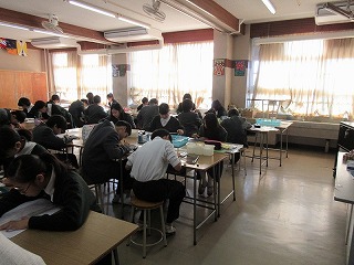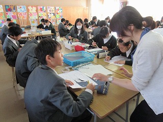 美術の授業を参観しました。1年2組です。ステンシル版画に取り組んでいました。動植物をモチーフにした下絵を元に、カッターで細かく切り抜いていく作業で、根気のいる作業ですが、皆、楽しみながら、集中して頑張っていました。どんな完成作品になるか、楽しみですね。