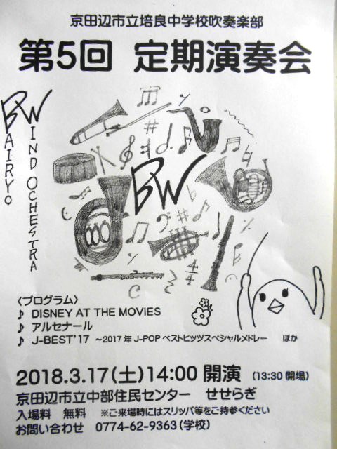 本校吹奏楽部の第5回定期演奏会が3月17日に開催されます。ぜひお越しください。