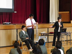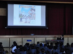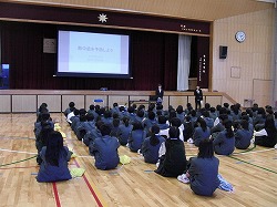 5時間の授業をしっかりと受けた後、6校時、体育館で、熱中症予防教室を行いました。講師は本校の養護教諭です。熱中症の危険性、本校ではどの時期、どのような状態の時、気をつけなければならないのか、予防するにはどうすればいいか、もし、熱中症的な症状が現れた時はどうするのかなど、図表も交え、わかりやすい説明がありました。