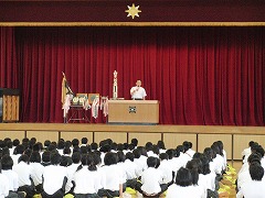 カナダから来られた新しいALTのナターシャ先生を紹介しました。日本語はまだ、少ししか話せませんが、英語と日本語で挨拶をしてもらいました。「私はこれから日本語を一生懸命学びます。あなたたちは英語を一生懸命学んでください。」というメッセージ。英語習得頑張りましょう。