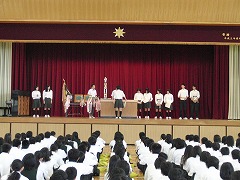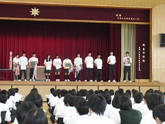 大会やコンクールの伝達表彰の後、ハンド部男子の全国大会優勝報告会を行いました。キャプテンの話の中で、支えてくれた友人や先生への感謝の言葉が印象的でした。