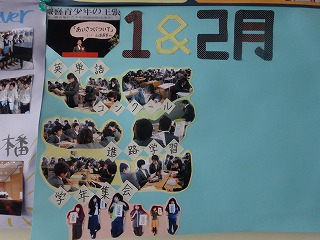 今日は、公立高校中期選抜。受検の無い生徒は、草内、田辺東両幼稚園に幼稚園訪問体験学習に出かけています。1年生はCRTテスト、2年生も実力テストと、今日はどの学年もテスト一色です。3月始めの掲示物を紹介します。