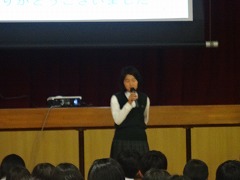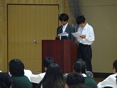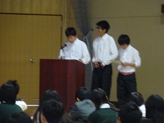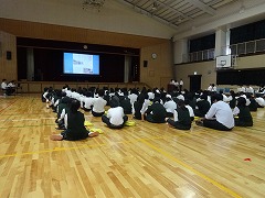 2年生は、5校時、体育館で、職場体験レポートの発表会を行いました。前回の予選で選ばれた、事業所別の18のレポートを発表しました。それぞれ、事業所での業務内容、苦労したこと、学んだことをきちんと整理して話せました。司会者も手際よく指示し、計画通りに行えました。自分が経験しなかった事業所の様子も、少しわかったと思います。たとえば、ケーキ屋さんに行ったチームのレポートでは、ケーキ屋さんはケーキを作っていればいいのかと思っていたら、掃除、皿・鍋洗い、ケーキ作りの下準備、箱作りなど様々な裏方の仕事や苦労があることがわかりました。やがて大人になったとき、自分自身がどんな職業を選ぶのか、自分の適性は何なのかを考え、学習に励みましょう。