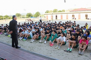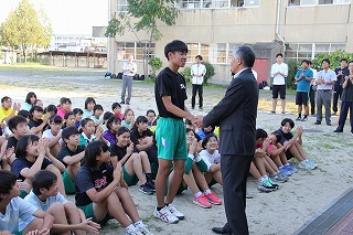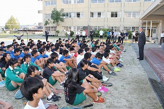 9月29日、新人戦の前日に、石井京田辺市長様が、部活の激励のために培良中に来られました。その時の写真を、市の広報担当から送っていただいたので、紹介します。その節には、心のこもった激励の言葉をいただき、部員一同、勝利への思いを一層強くしました。石井市長様、ありがとうございました。