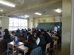 1 年生は、総合的な学習の時間を利用して、人間関係づくりの授業を行いました。カウンセリングの一種である構成的グループエンカウンターという手法を用いて行いました。具体的には、班ごとにみんなで問題を解くのですが、各人には様々な情報がぎっしり書かれている紙が渡され、その紙を見せることなく、言葉だけで情報をやり取りし、話し合って最終的にはみんなで課題を解くという内容です。どの学級、どの班も熱心に、楽しそうに話し合って問題を解いていました。その過程で、互いの人間性を理解しあえることがこの取組の狙いでした。