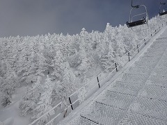 かなり滑れるようになって、中間リフトから頑張って滑っています。 山頂近く 風雪のため木が大きく育ちません。