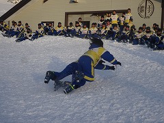 学年レク 雪上リレー スノーフラッグ レクのころには快晴に