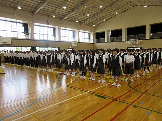 本日6校時、9月26日の文化発表会当日に向けて、全校合唱の練習を行いました。今までのように教員が指導する練習とは違い、夏休みからしっかり練習に取り組んでいた合唱のリーダーたちと生徒会本部が、練習をリードしてくれました。