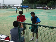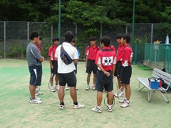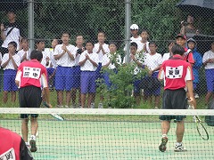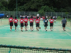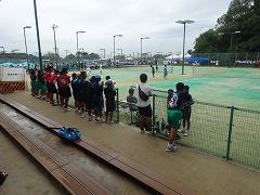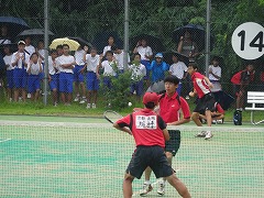太陽が丘のテニス場で標記の大会が開かれました。梅雨が明けたばっかりなのに、今日は朝から雨模様でした。試合の途中から本降りになり、選手も応援も大変でしたが、本当に熱の入った試合となりました。団体戦1ー2で敗れましたが、どの試合も、すべてフルセットまでもつれこむ接戦でした。応援の声や手拍子もすごく出ていて、本当に一体感のあるいい試合でした。わずかなミスや小さな差が試合を分けましたが、テニス部として山城大会の場でこのような試合ができたこと、素晴らしいことだと思いました。