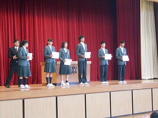 伝達表彰では、外部のコンクール等へ出した作文や標語、、計算コンクールで頑張った学級、マラソン大会の上位入賞者等の表彰を行いました。