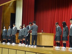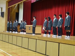 全校終礼の後、新旧生徒会本部の引き継ぎ式を行いました。会長が代表して退任のあいさつをしましたが、「いじめ追放宣言」の制定など歴史に残る仕事をやり終えた充実感と、一方で不十分に終わった部分があり、次の生徒会に託す思いが、よく表れていました。この生徒会本部は、活動中、とっても楽しそうで、本部役員同士とても仲が良い、いいムードだと思っていました。様々なことにきびきびとよく動いてくれました。本当にお疲れ様でした。