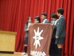 生徒会旗が新役員に渡され、新会長から新しいメンバーの紹介と抱負が語られました。メンバーのフルネームを何も見ないですらすらと紹介した新会長を見ていて頼もしく感じました。