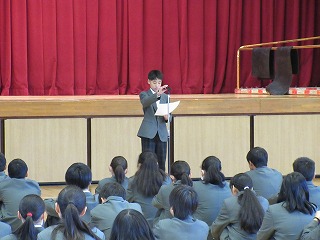 本日3校時に、1・3年、4校時に2年生の、2学期まとめの学年集会が行われました。どの学年も学級委員が中心になって、学習面、行事面、生活面全般について、学級で達成できたことや課題点などを明らかにして、発表してくれました。2年生は、京田辺市の「子どもの主張大会」や「英語スピーチ大会」に参加した生徒による発表もありました。各学年とも2学期の学年のまとめがしっかりできました。