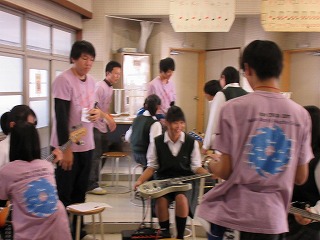 京都翔英高校(生徒による軽音楽) 数十名の高校の生徒さんに来ていただき、軽音楽の楽器の基礎を丁寧に教えていただきました。ドラム、ギター、ベース、キーボードで最後は演奏にも挑戦しました。