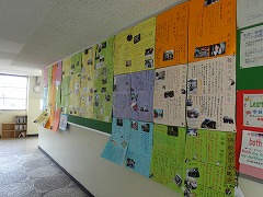 3年生の学年掲示板に、3年生の学年の目標と、先日、学級で発表した進路体験学習のレポートが掲示されました。紹介します。